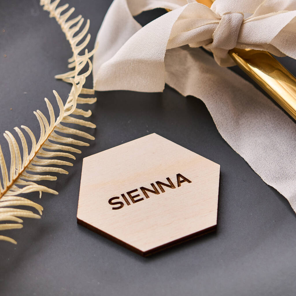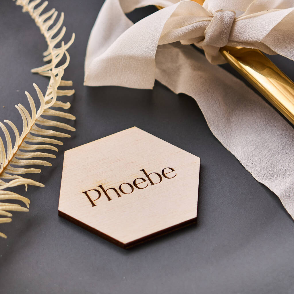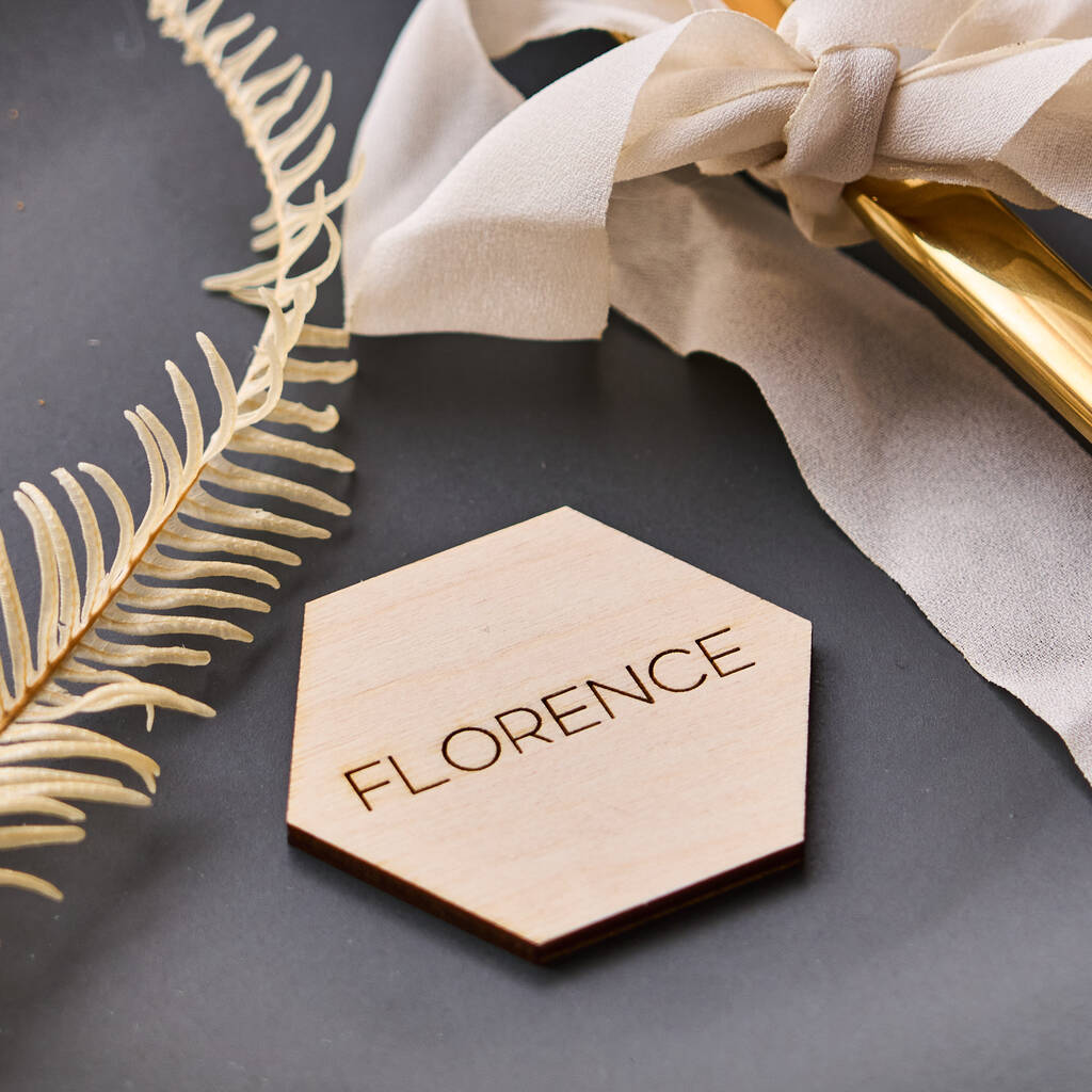 Simply let us know your guest list by entering their names in the personalisation box provided, we will then delicately engraved them onto our wooden hexagonal place settings.