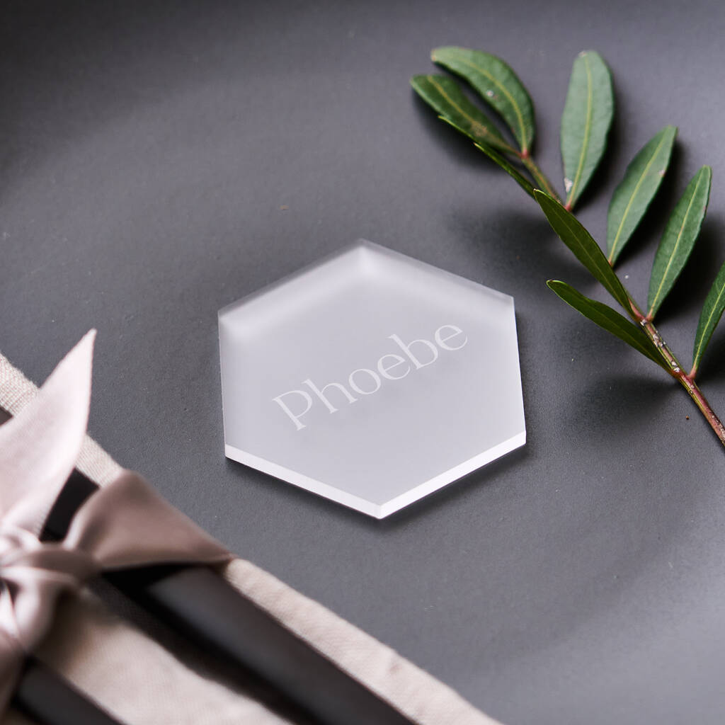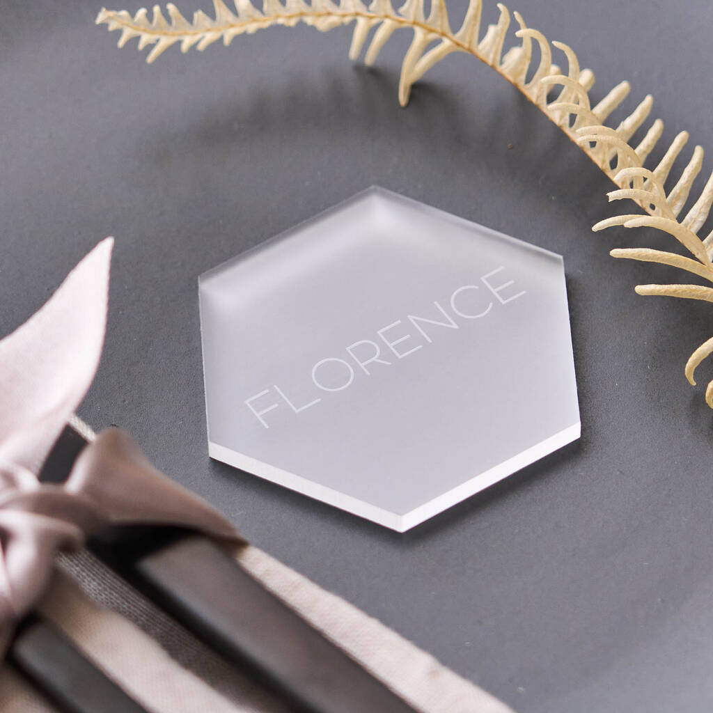 Add a romantic and whimsical feel to your table styling, and help your guests find their seats with our Frosted Hexagon Wedding Place Setting.